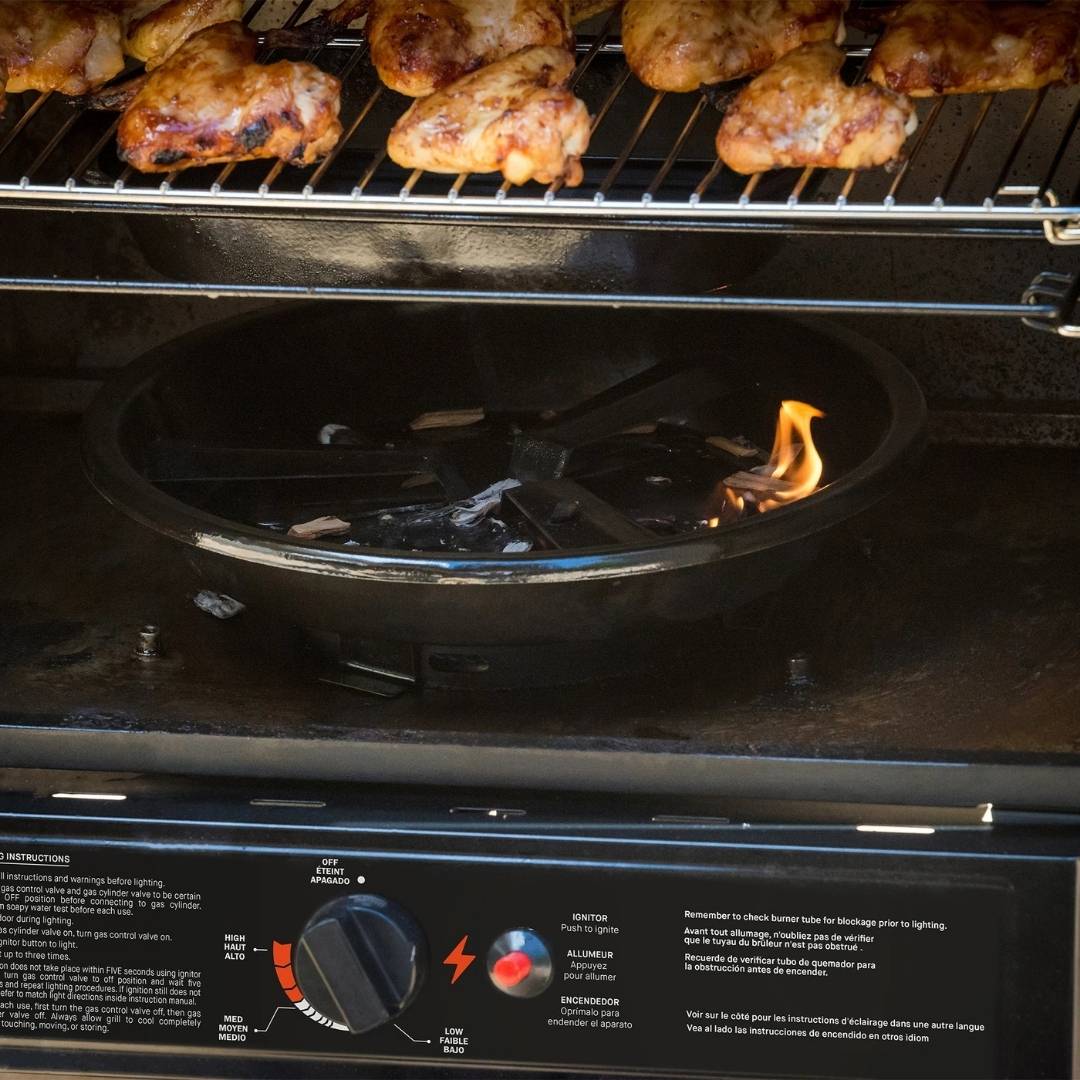 - Porcelain-coated flame disk bowl protects burner and directs flame